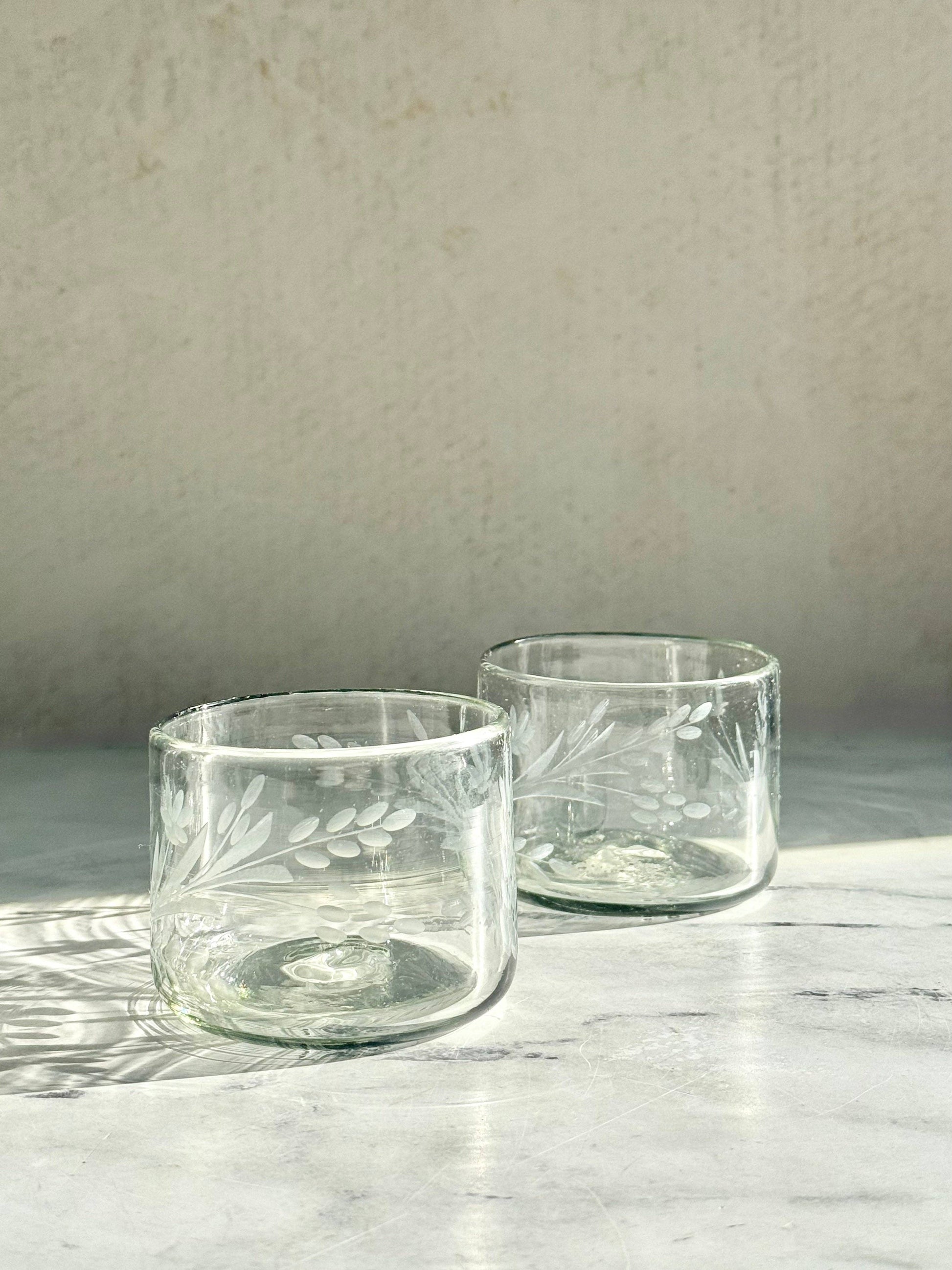 Short, wide and featuring an etched floral design, this lovely vessel will soon become your new favorite for wine, water, appetizers, desserts, and more!