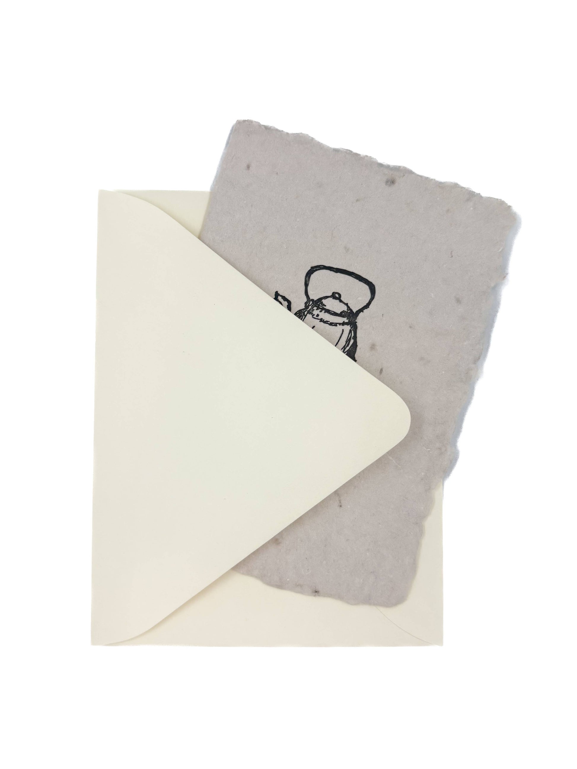 Handmade paper card with four full deckled edges, hand folded with inside blank. Front is letterpress printed; back is letterpress printed with a small note including information about the natural dyes used to color each unique piece of paper.