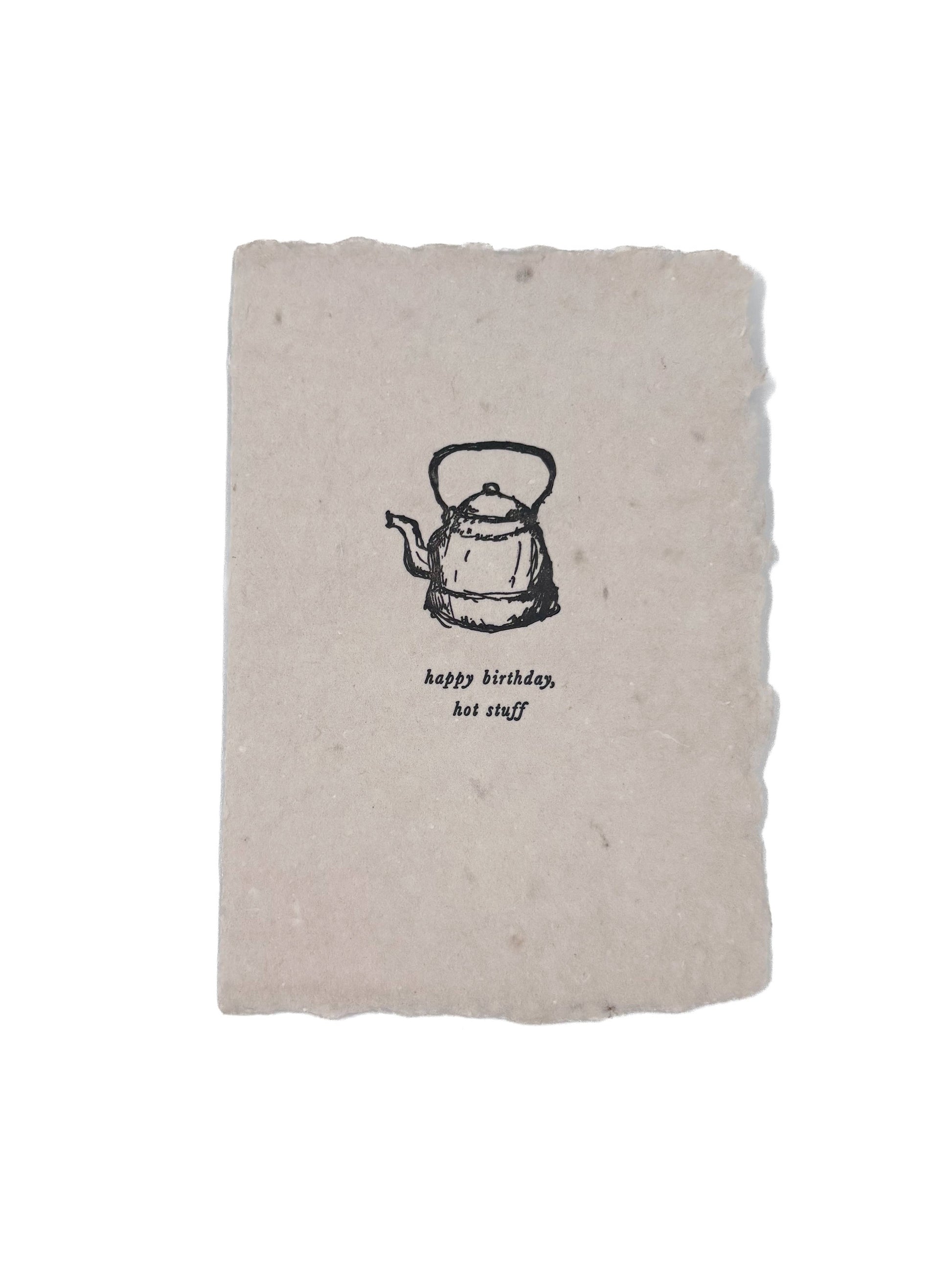 Card features an illustration of a kettle and reads “happy birthday, hot stuff”.