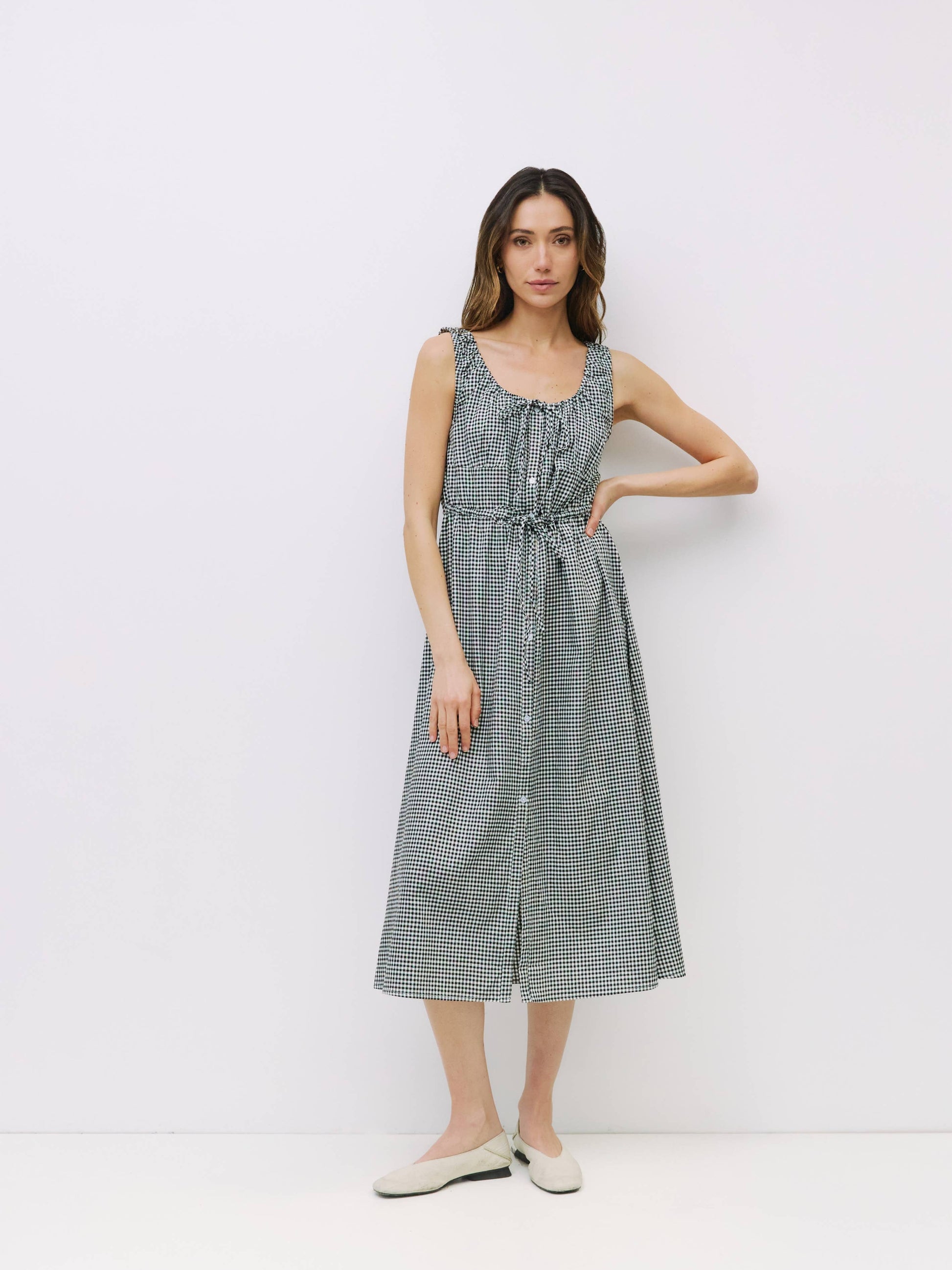 A sleeveless gingham midi dress featuring a gathered neckline and waist with adjustable ties for a custom fit.