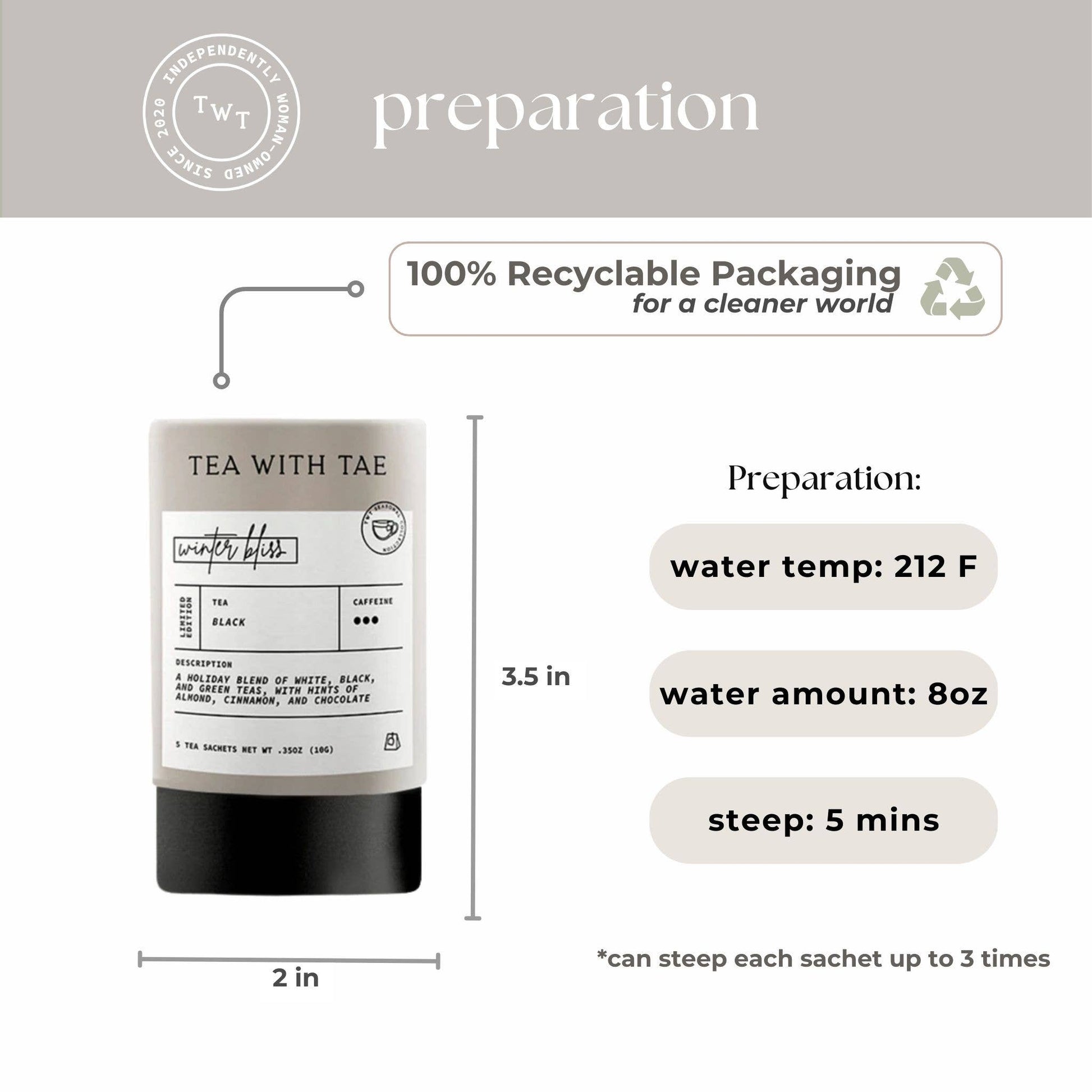 Each mini tea tube is 2” wide and 3.5” tall and is made from 100% recyclable rigid paper tube material. Inside are 5 pyramid tea bags that are made from premium, plastic-free, biodegradable material. Each tea bag holds approximately 2-2.5 grams of whole-leaf tea and herbs.